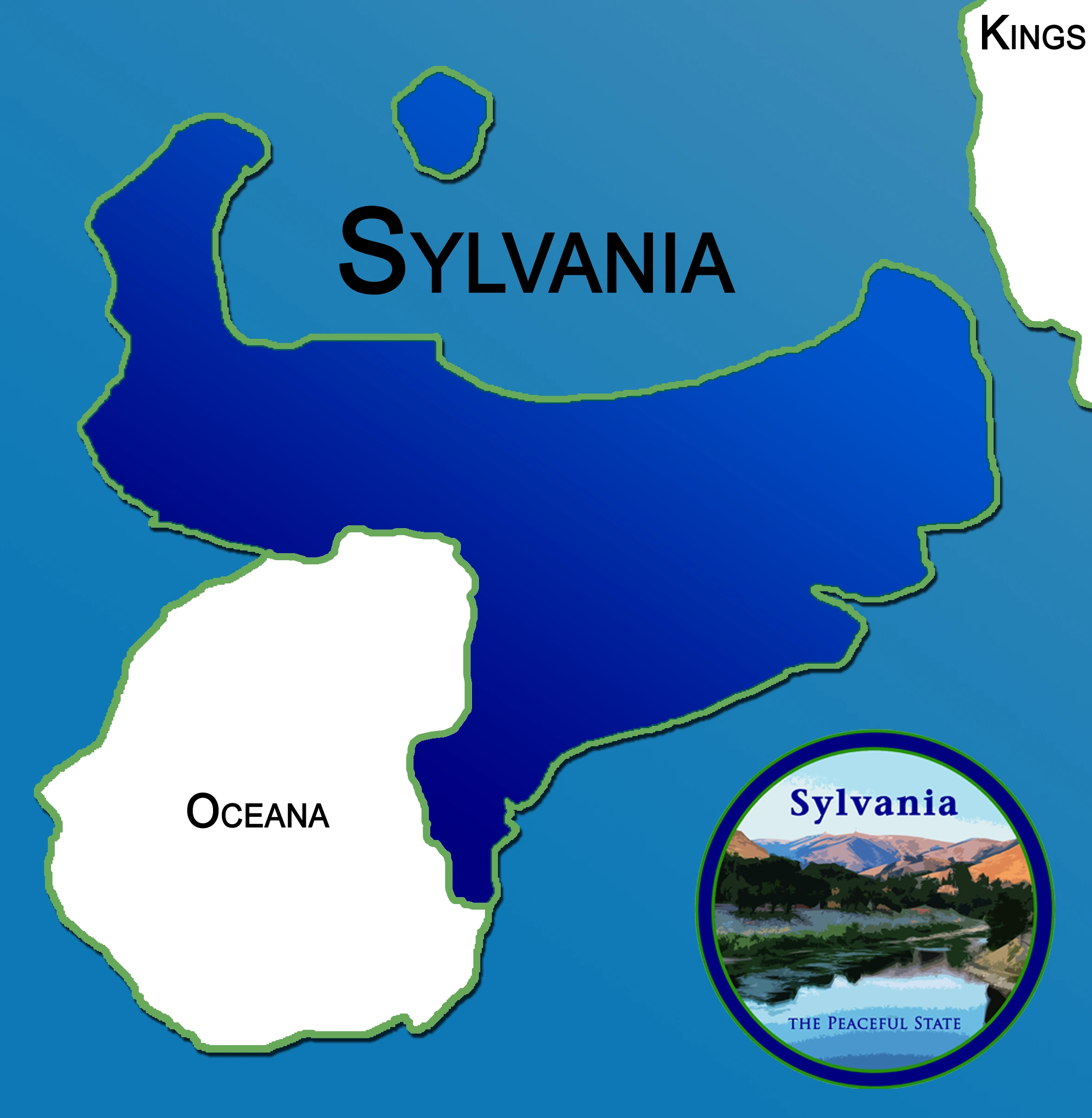 Sylvania is a very green state and counts lots of hills and forests. The state's most simple division is in Eastern Peace Island, that occupies almost the entire state surface, and the Discovery Isle. The Eastern Peace Island is roughly dividable in several geographical regions: